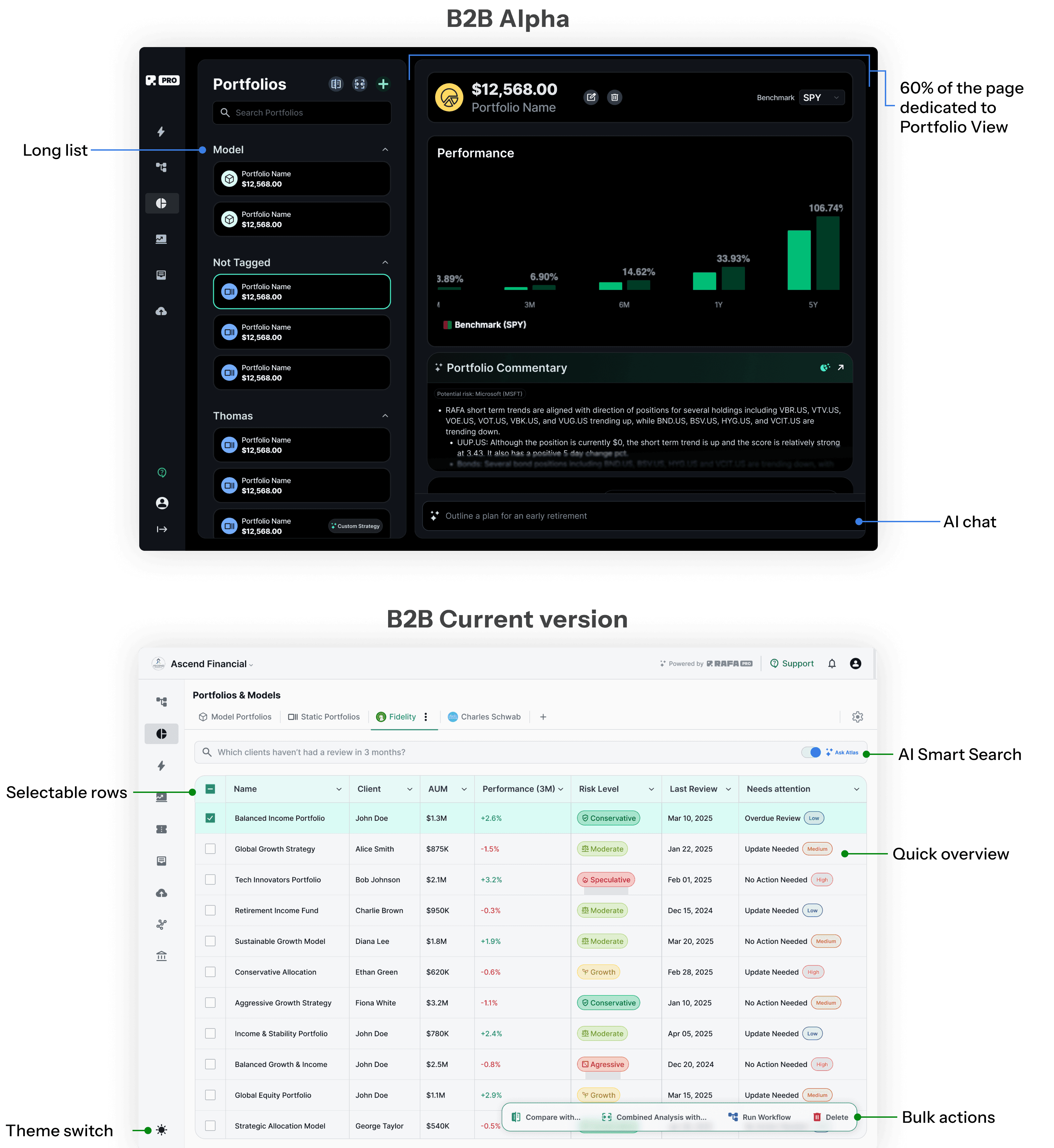 As advisors loaded their client portfolios, problems emerged. Navigation felt cumbersome, they had to scroll through long lists and click into each portfolio just to see what needed attention. The deep-dive analysis we offered held little value; they needed quick overview and fast action.