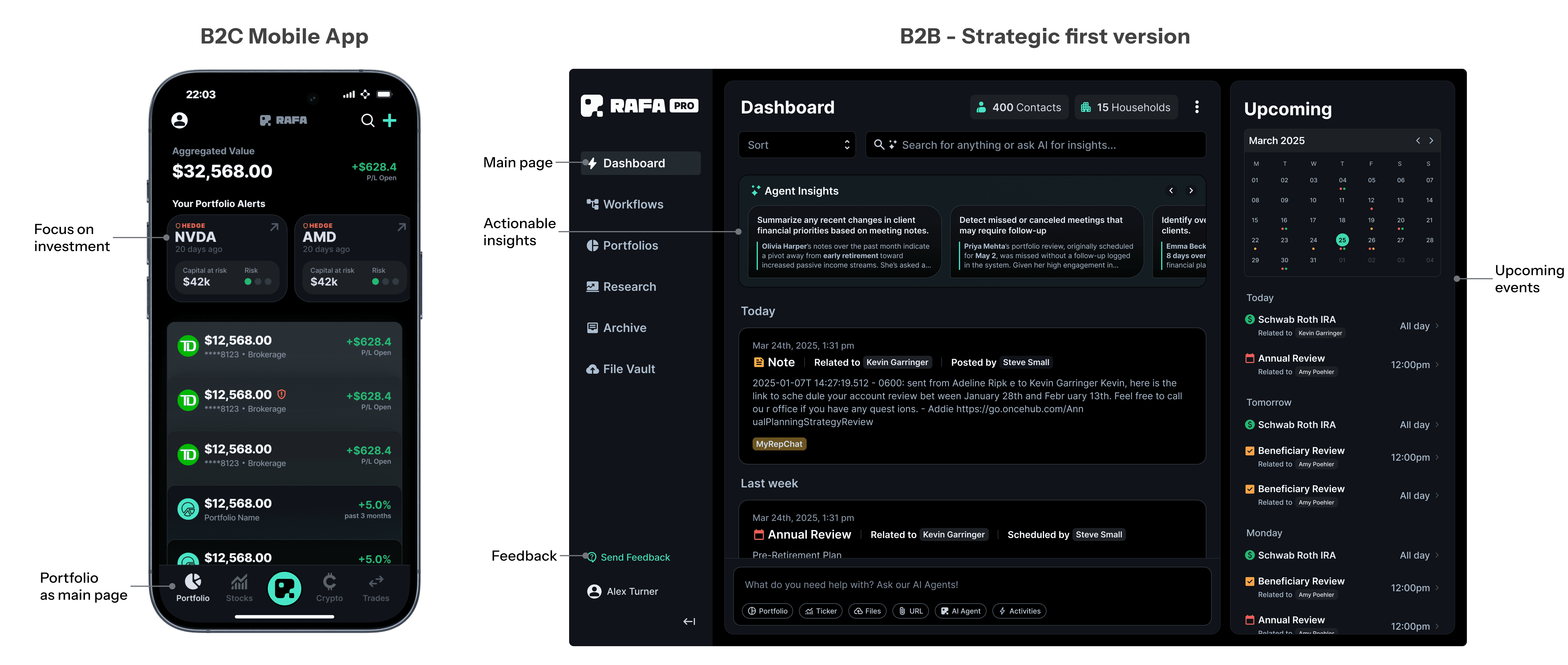 Over the past year, I designed RAFA PRO, a B2B investment AI-powered platform for financial advisory firms. Starting from a B2C foundation, I evolved the product through continuous testing and iteration. Seven months after official launch, the platform now serves 50+ firms.