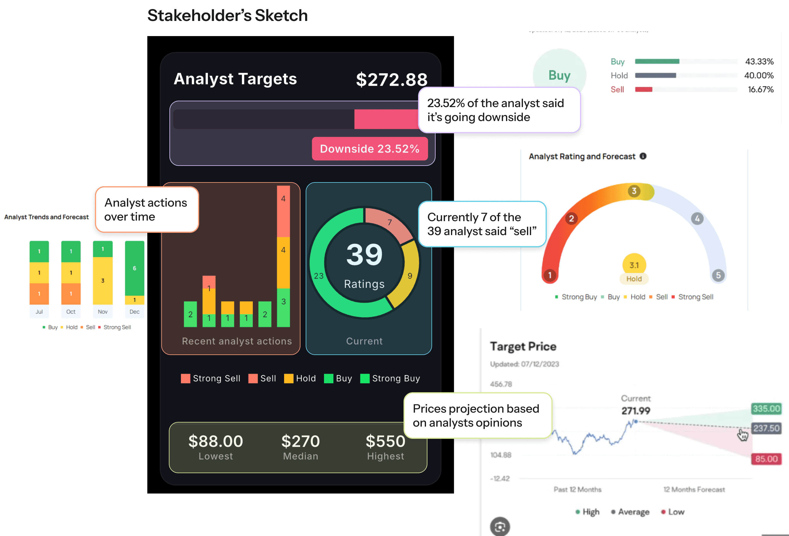For Analyst Ratings, I created a doughnut chart showing current opinions from strong buy to strong sell, with a short contextual explanation from our AI Agents